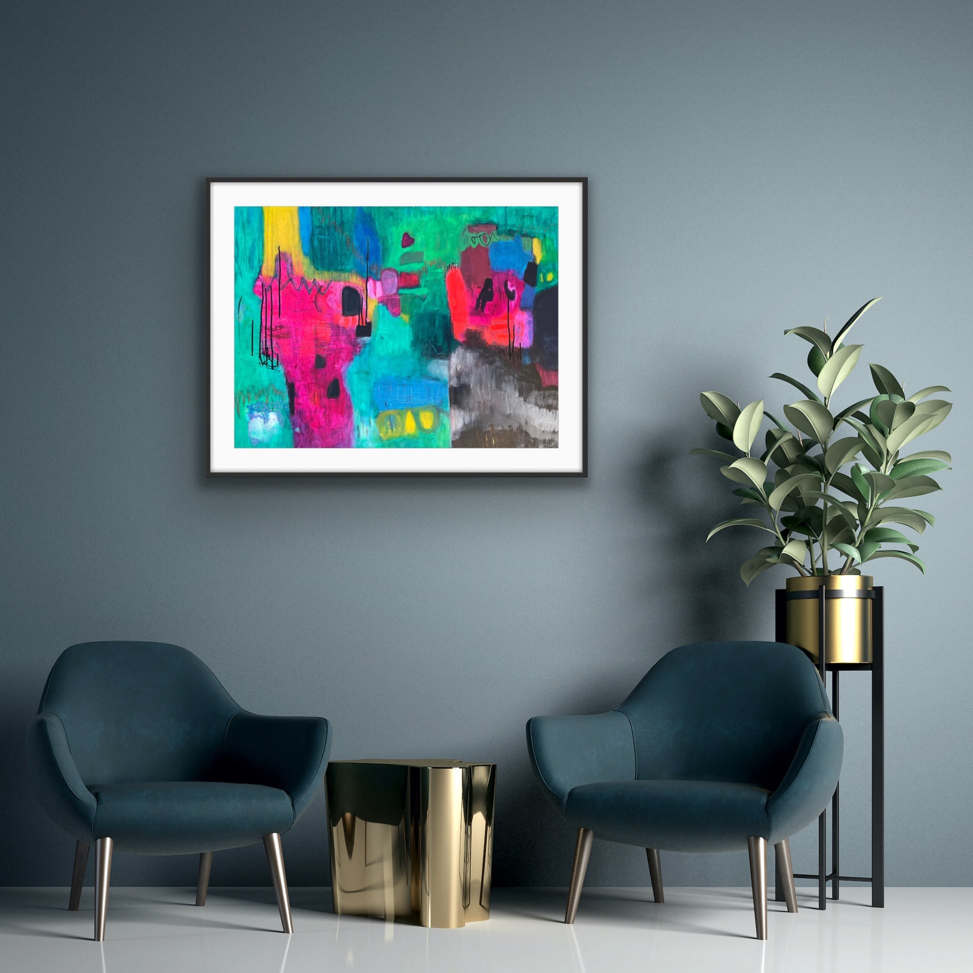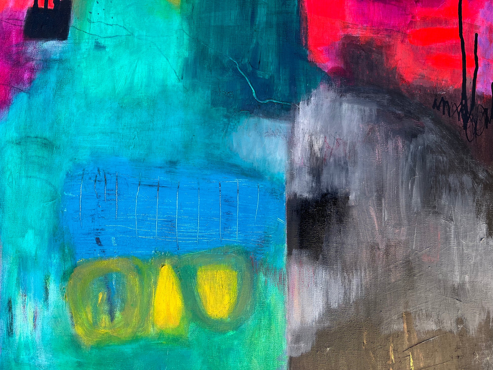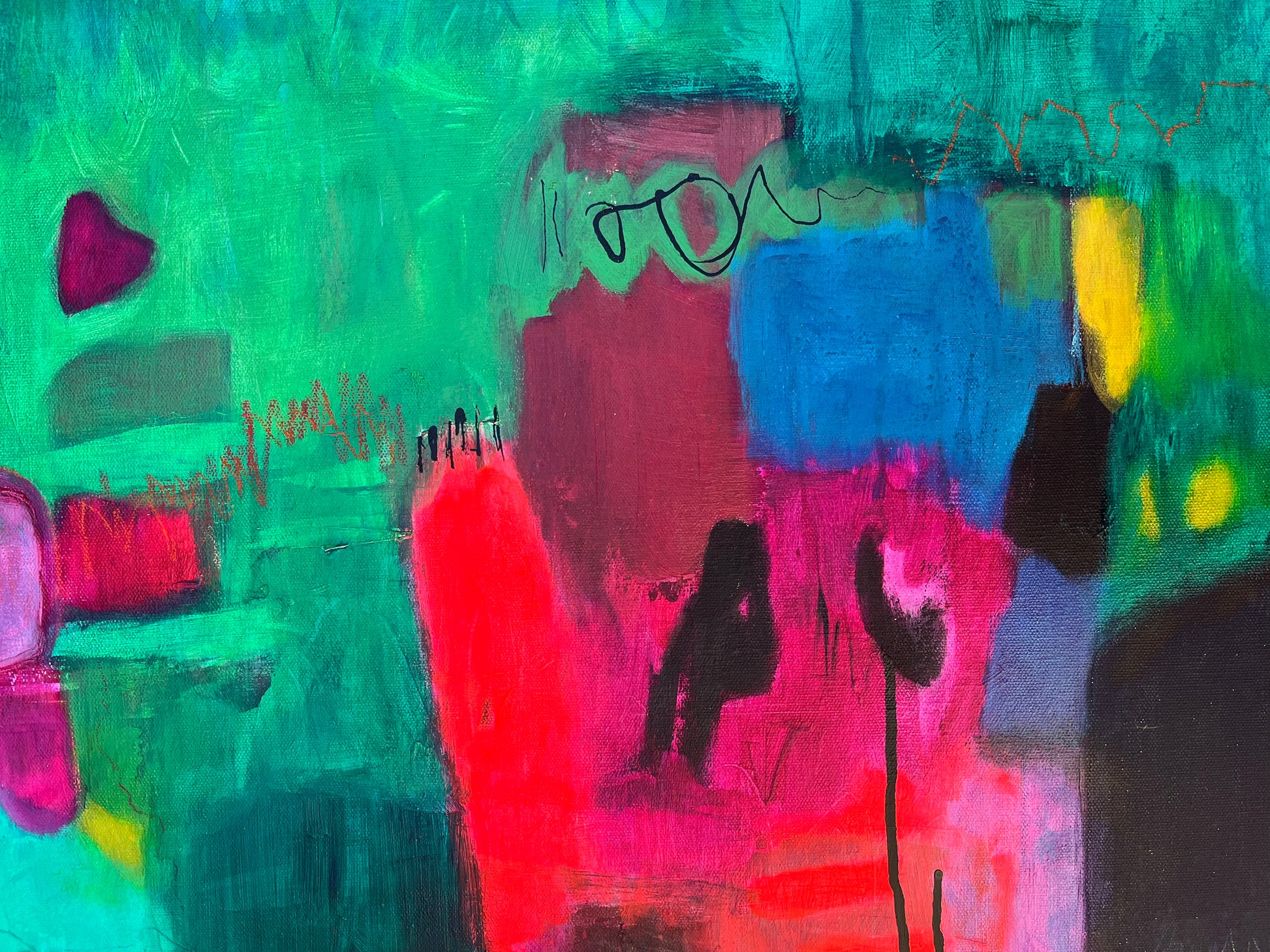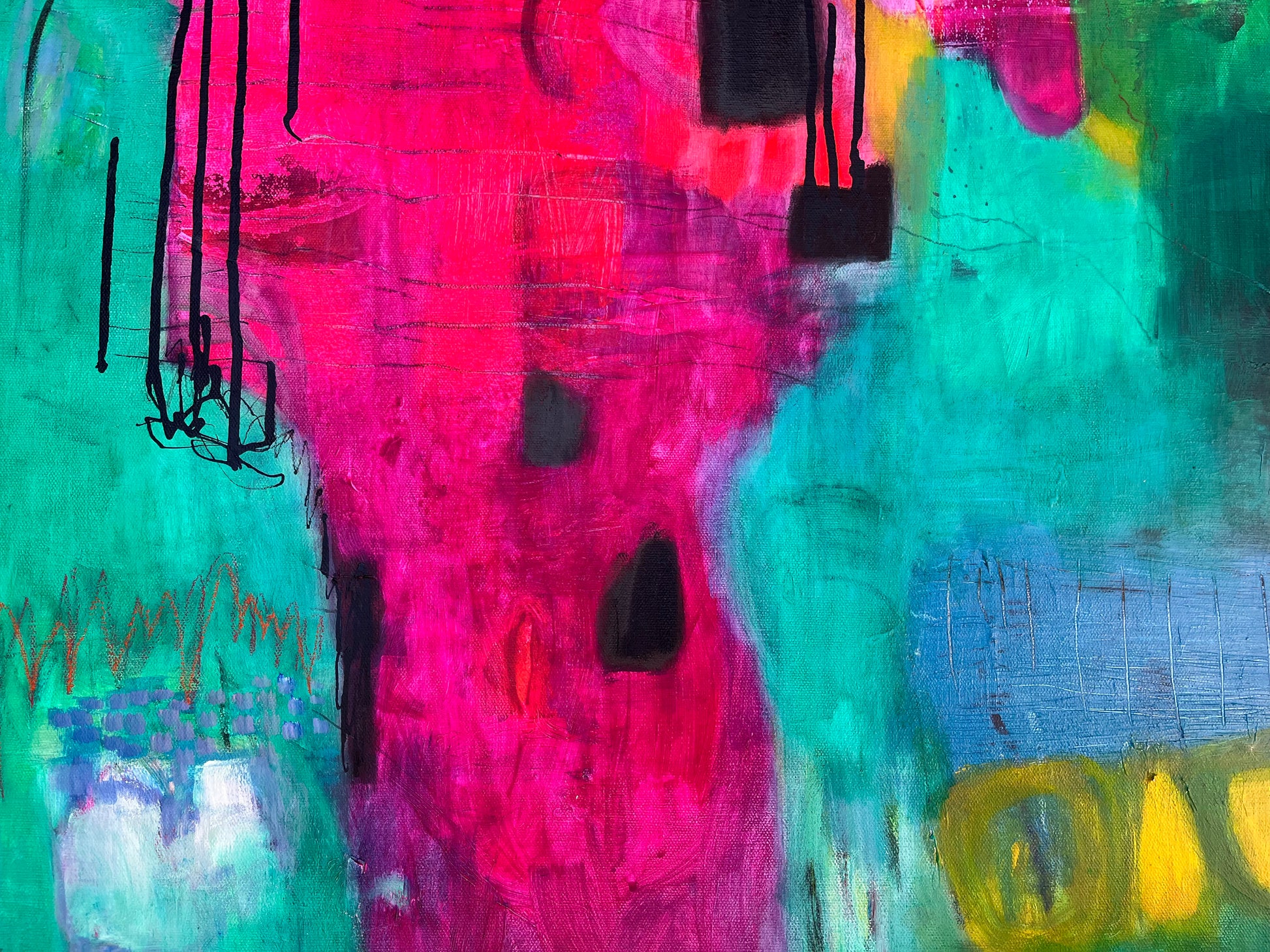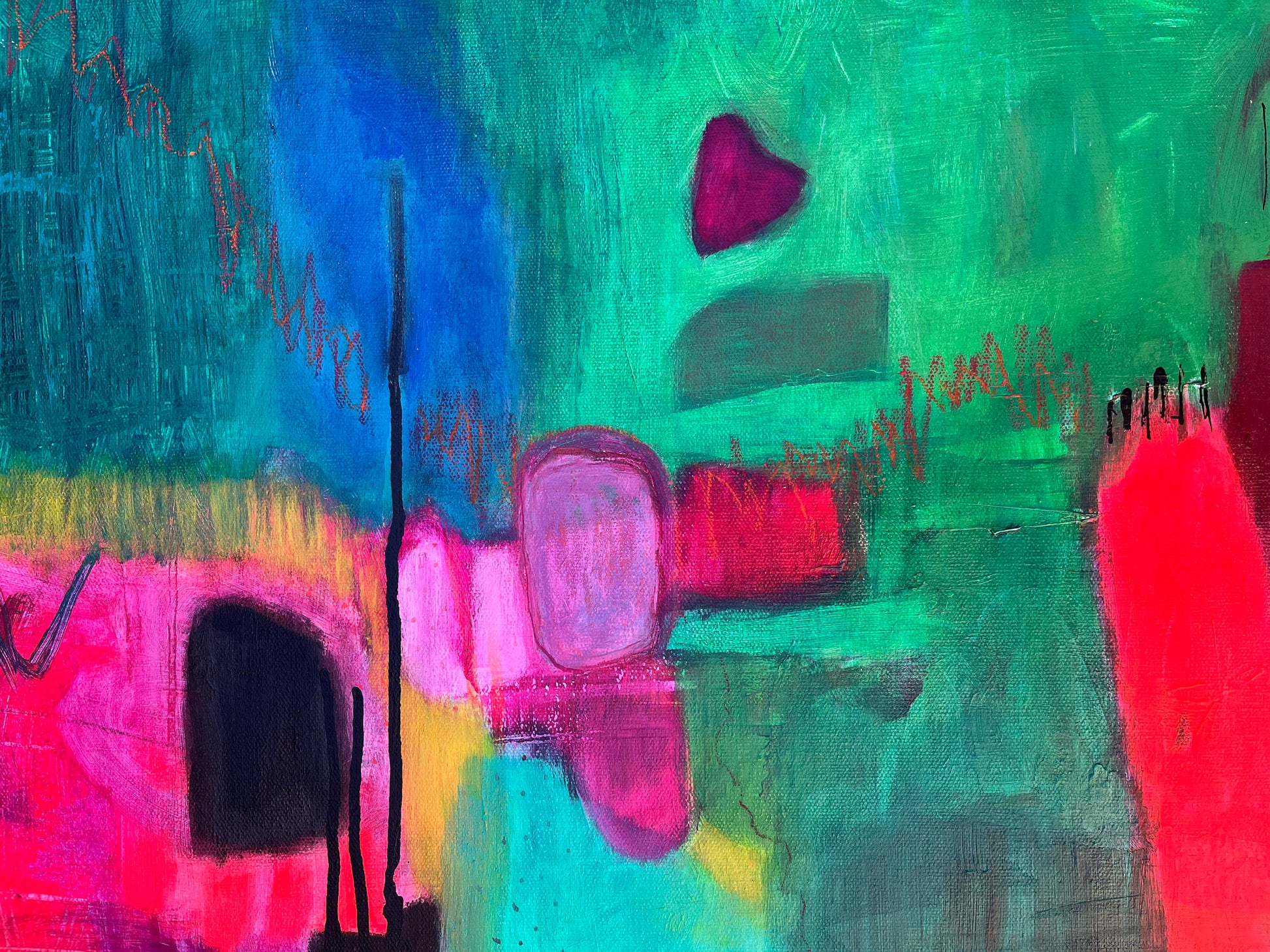 This painting wasn't easy to come by, and took many layers to arrive at its final composition. It is starkly unique, with all of its details and bright colors. There is a hidden heart, a possible pair of sunglasses, and a design that reminds me of an intricate Moroccan rug. Beyond that, it brings a feeling of the richness of life, with varied experiences and emotions that we weave into the fabric of our lives to reveal a beautiful tapestry.