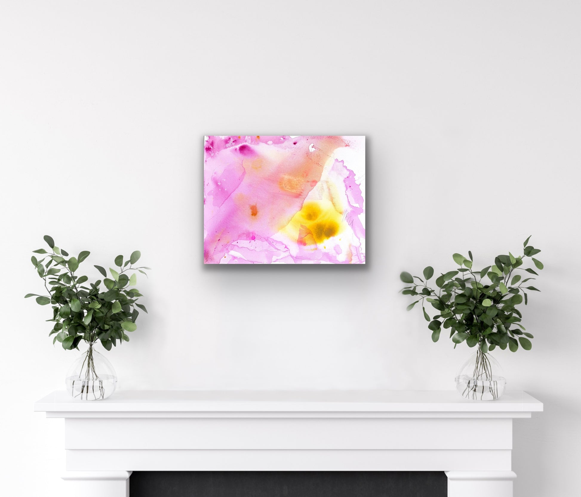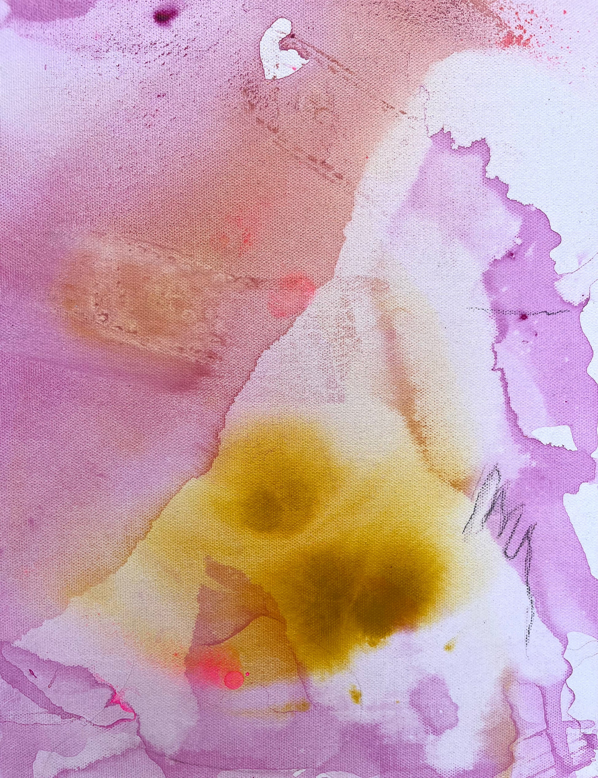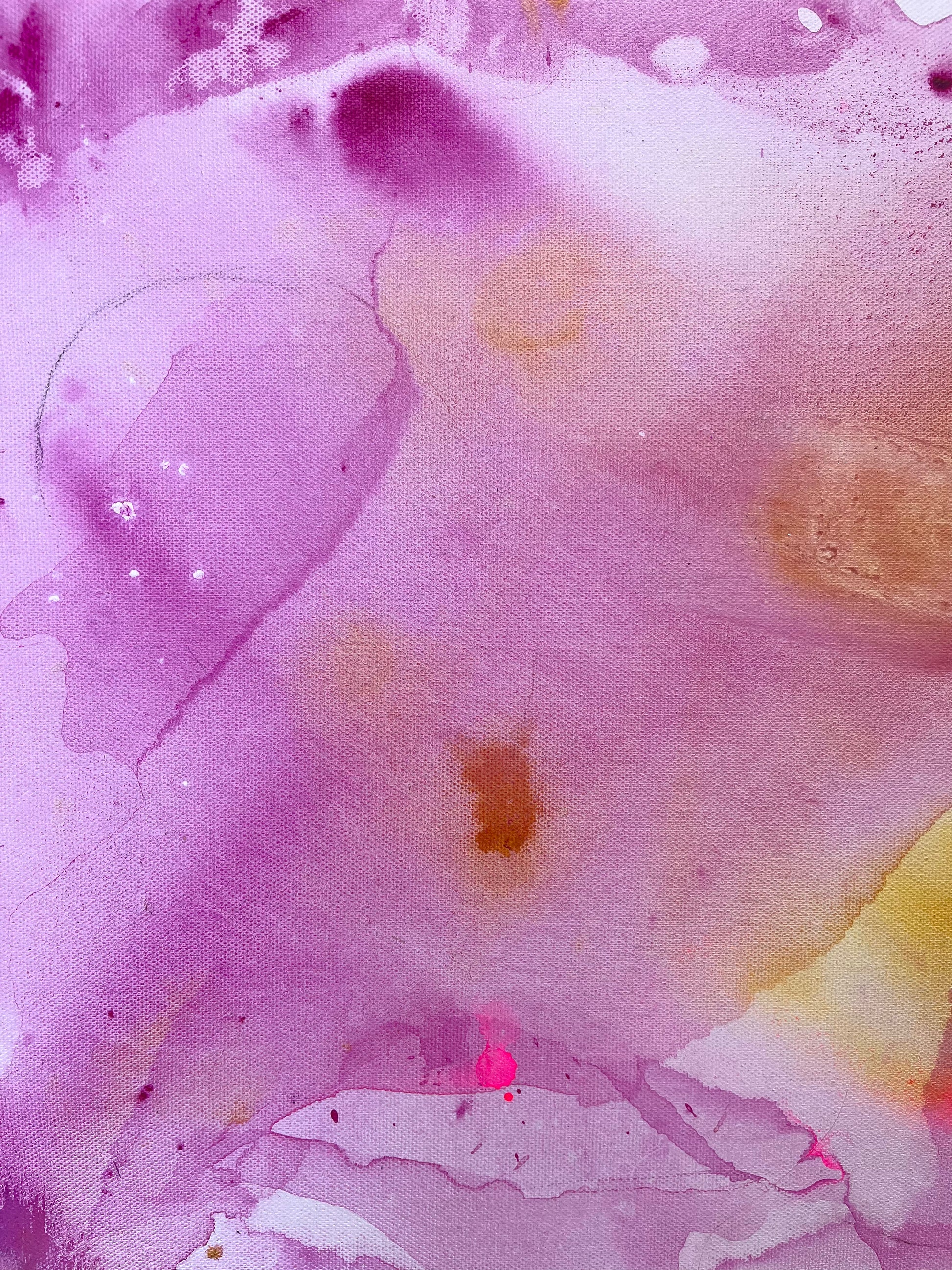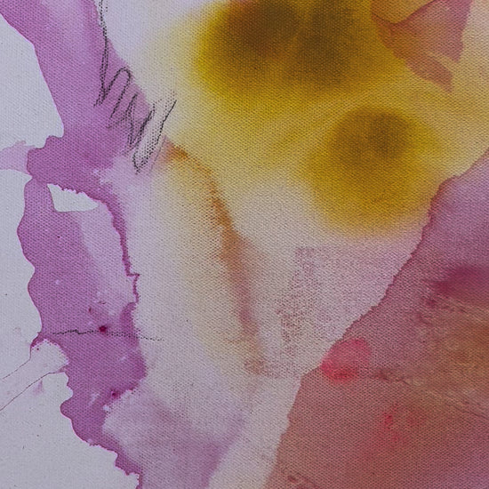 Marigolds was created naturally by swirling water and ink on raw canvas. The final design reveals a likeness to crushed marigolds, lying on a satin tablecloth, following a colorful celebration. It brings the energy of living out loud, seizing the moment, and being wide open to love.