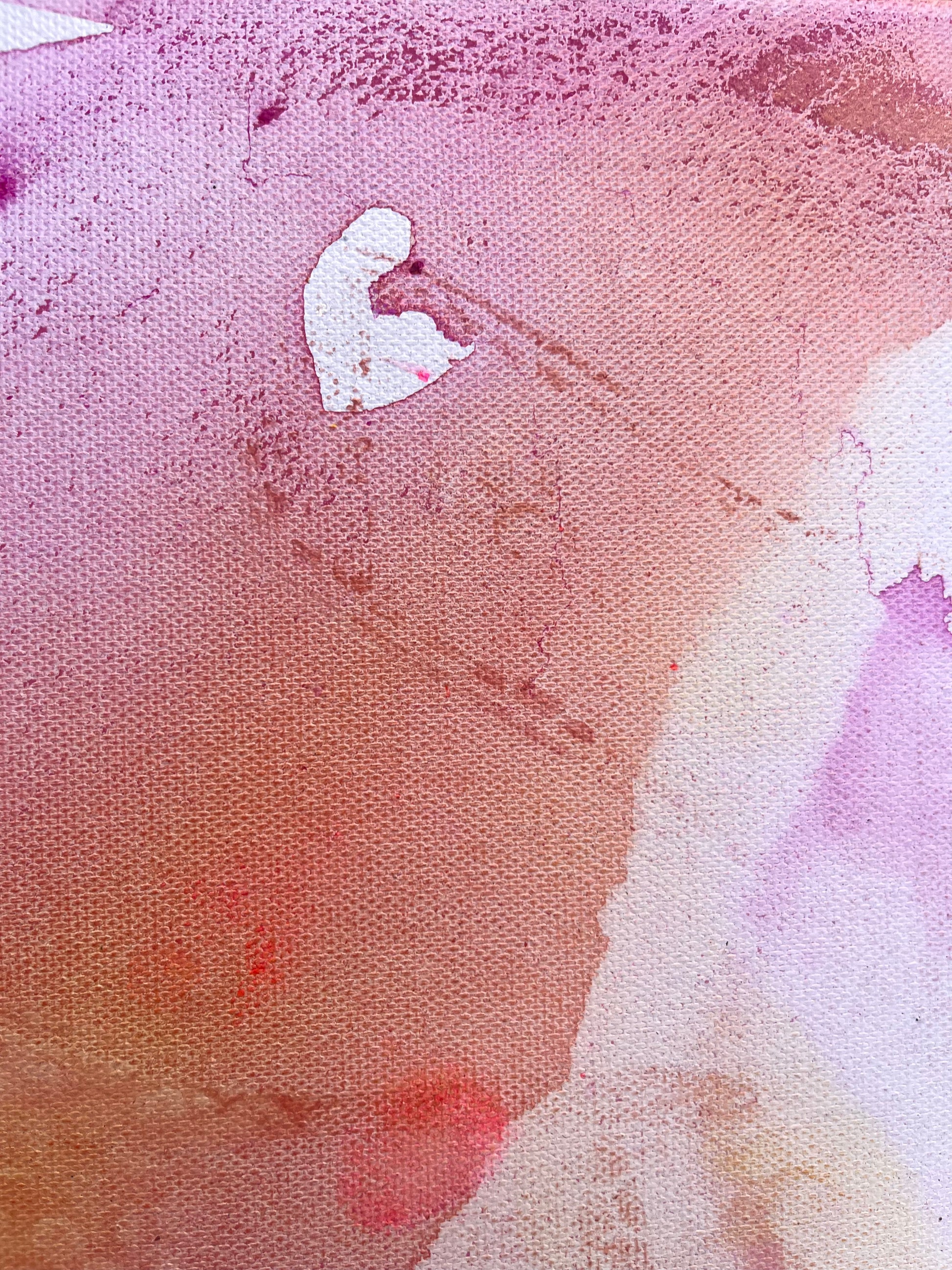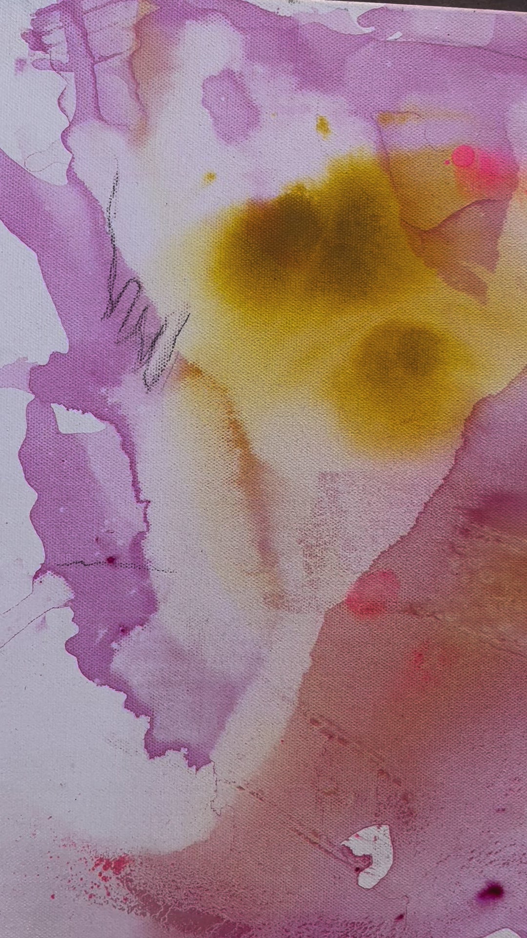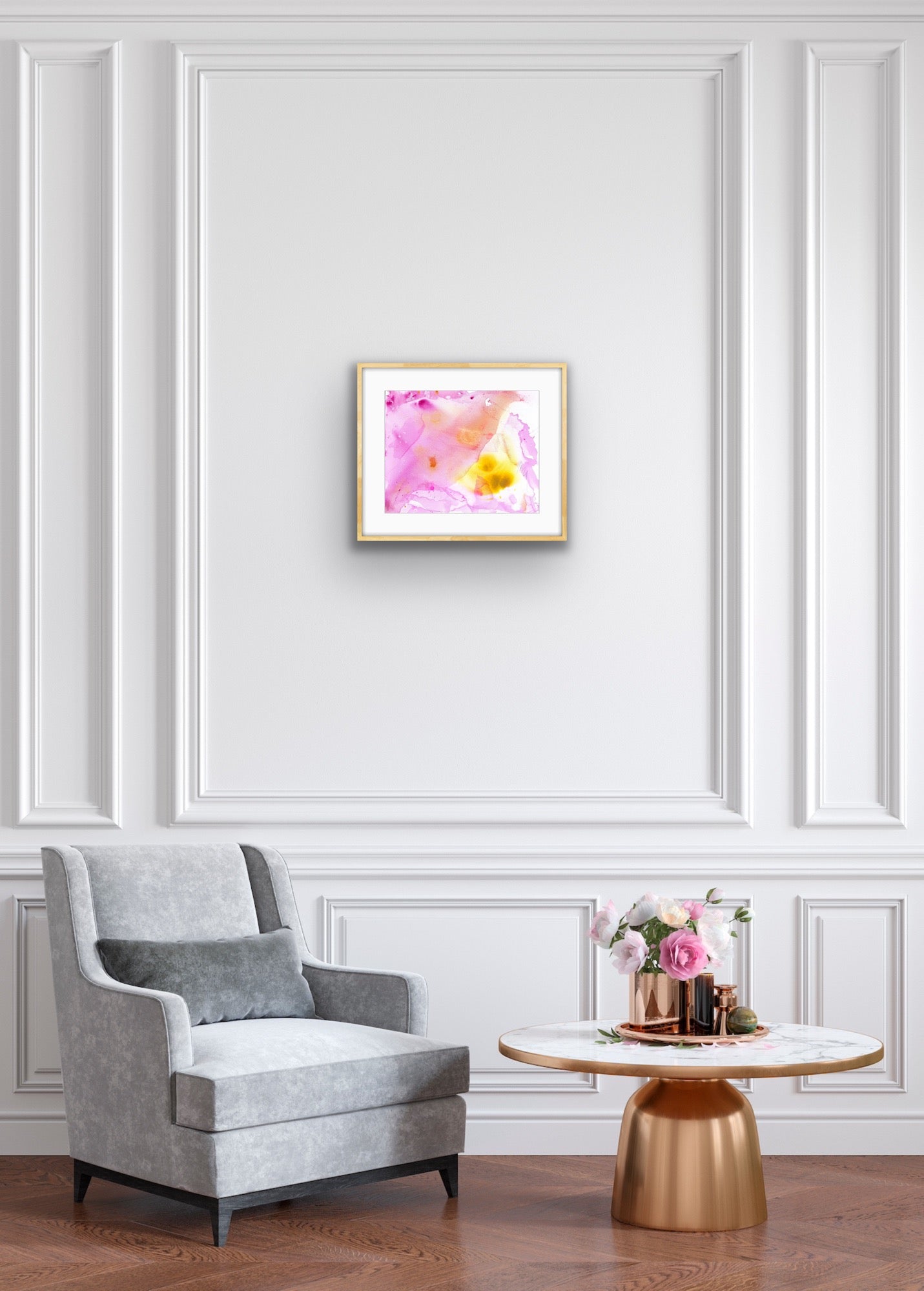 Marigolds was created naturally by swirling water and ink on raw canvas. The final design reveals a likeness to crushed marigolds, lying on a satin tablecloth, following a colorful celebration. It brings the energy of living out loud, seizing the moment, and being wide open to love.