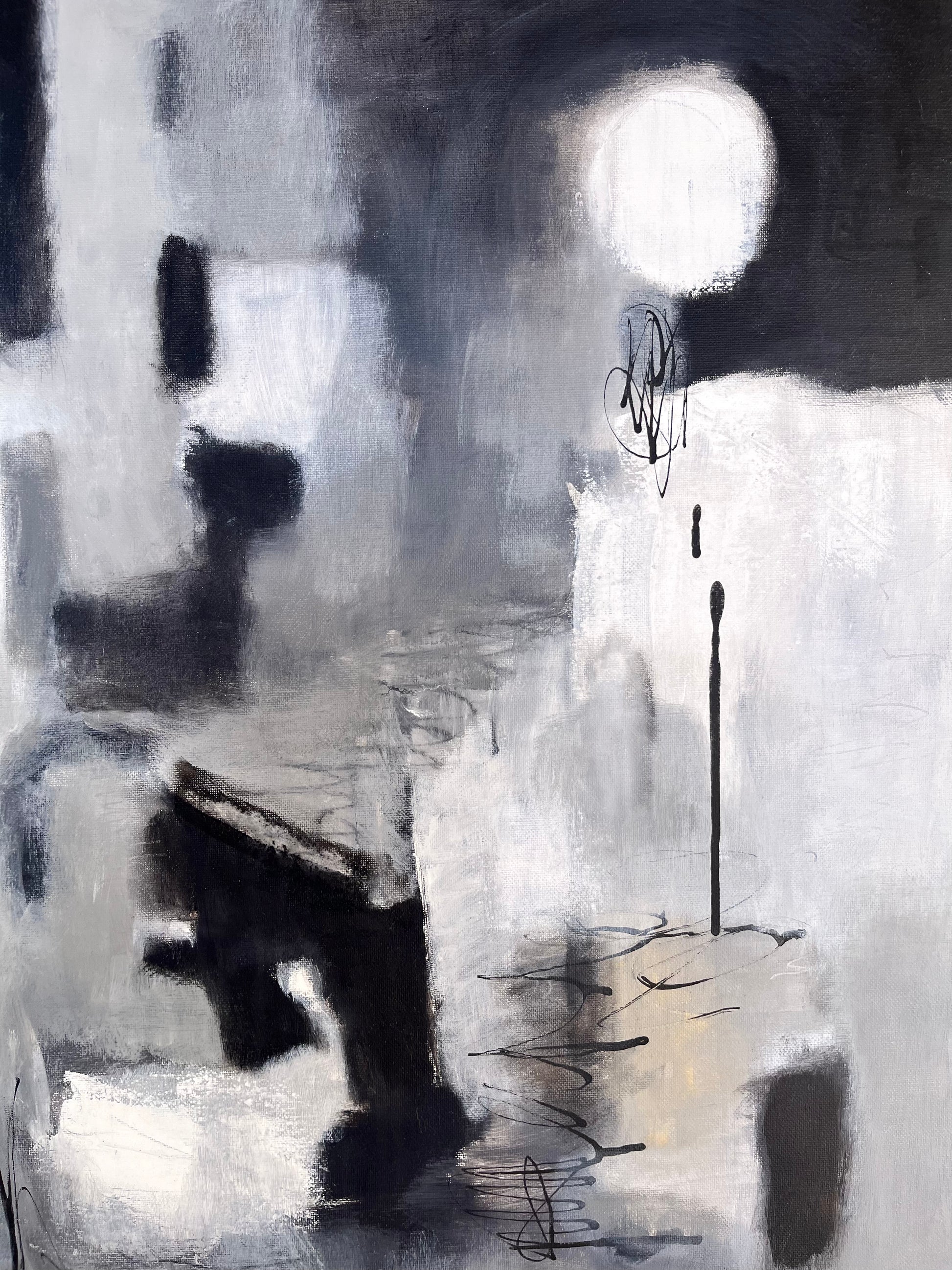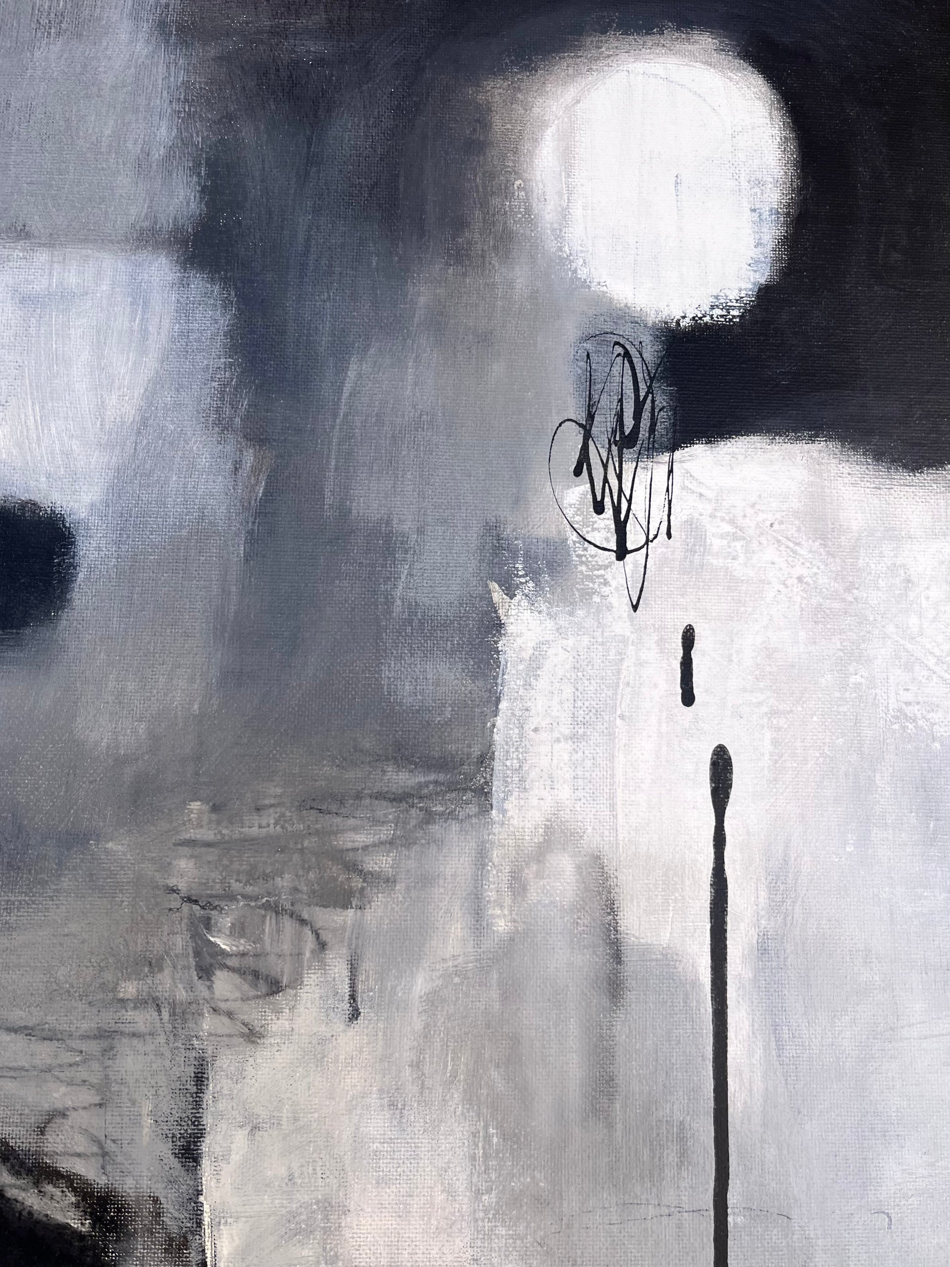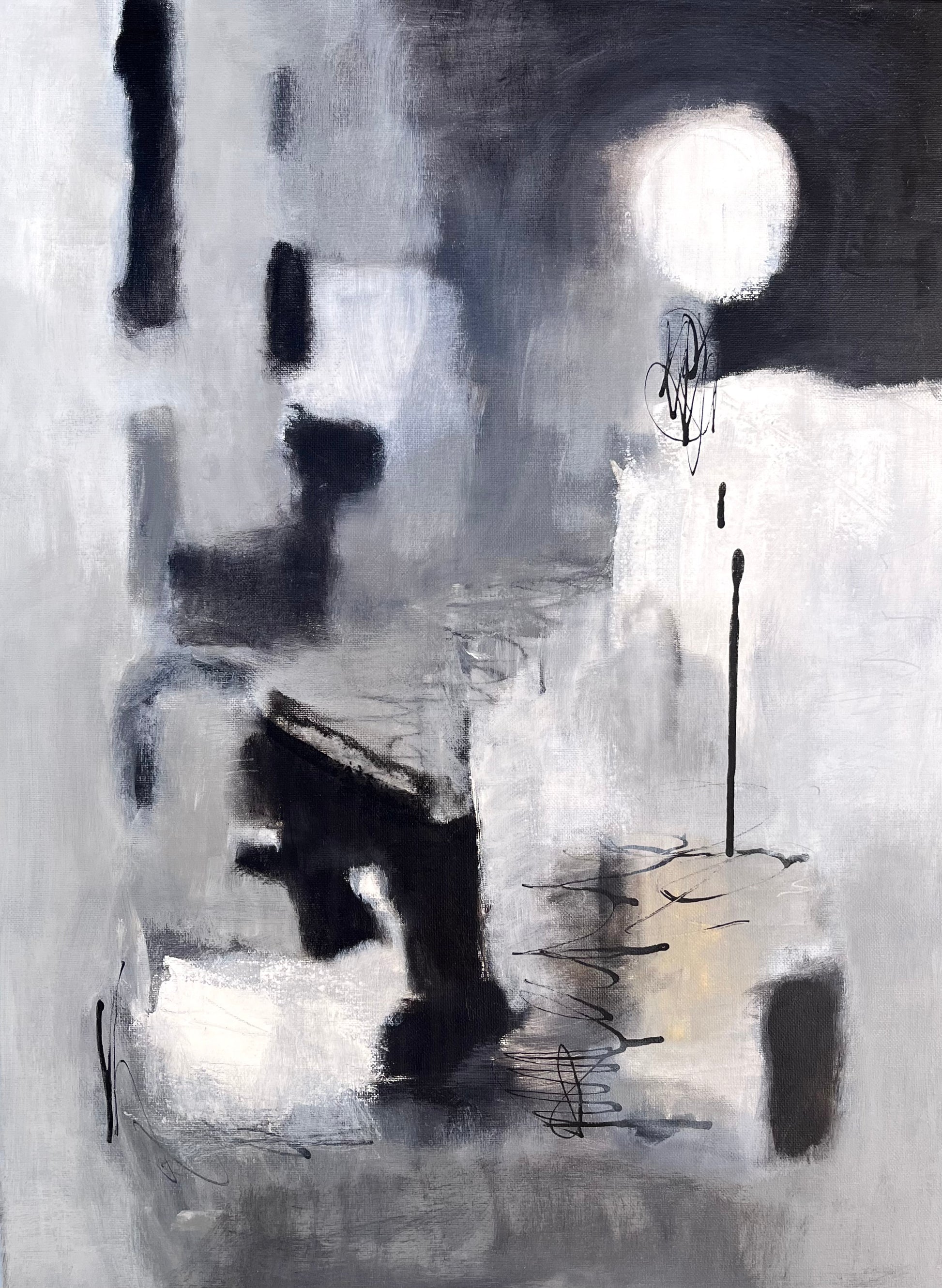 This abstract piece captures the dreamlike essence of a full moon, bathed in a delicate balance of black, white, and gray tones. The ethereal composition evokes a sense of calm and mystery, where raw, unrefined brushstrokes meet the precision of black ink details. The acrylic medium adds depth and texture, creating a celestial atmosphere that feels both otherworldly and grounded. A perfect fusion of delicate beauty and bold presence for any space.
