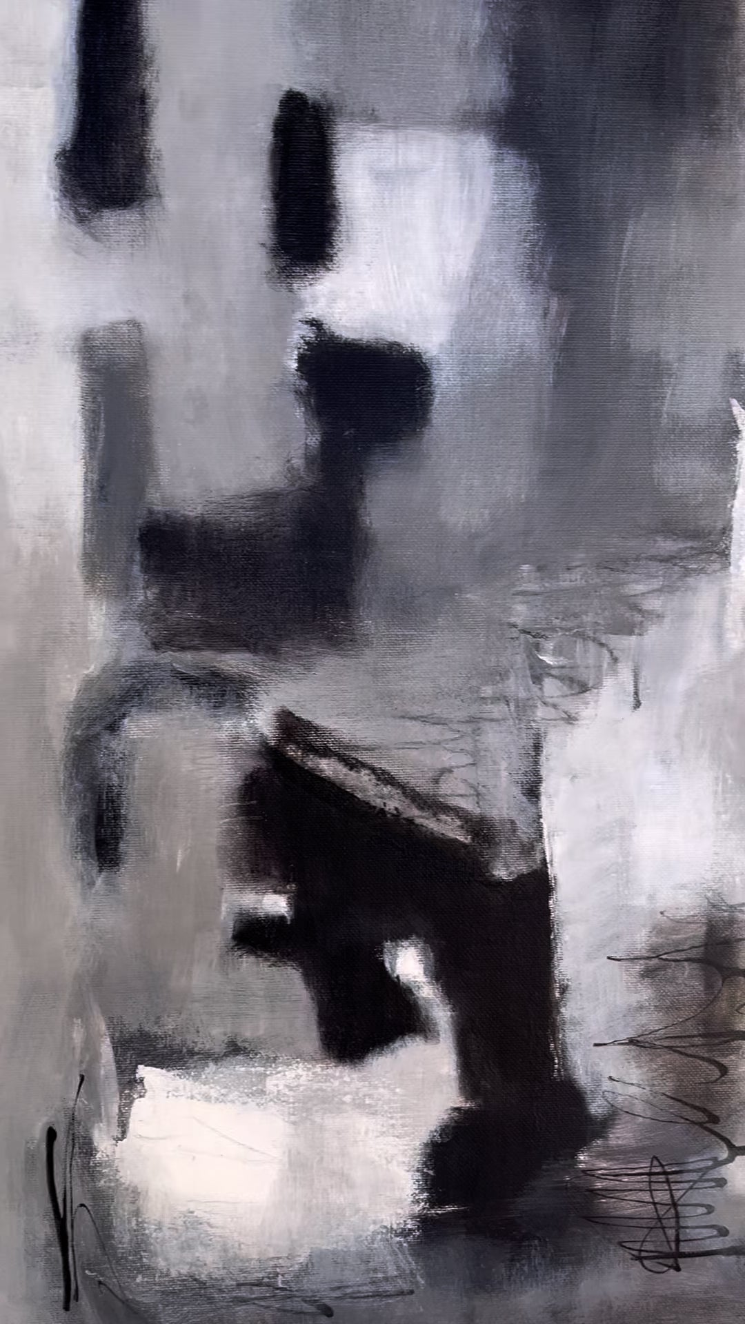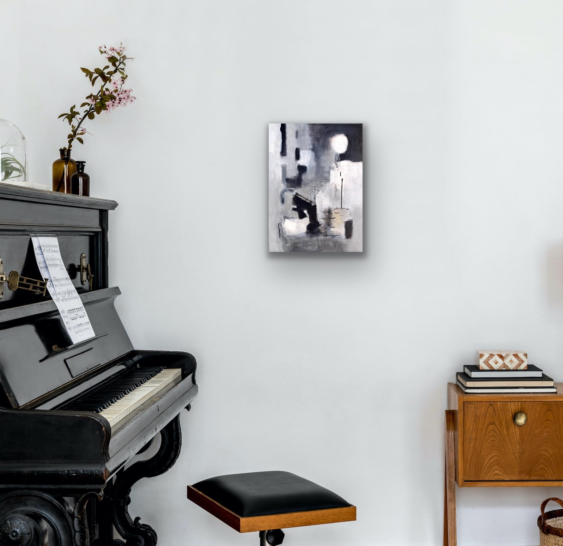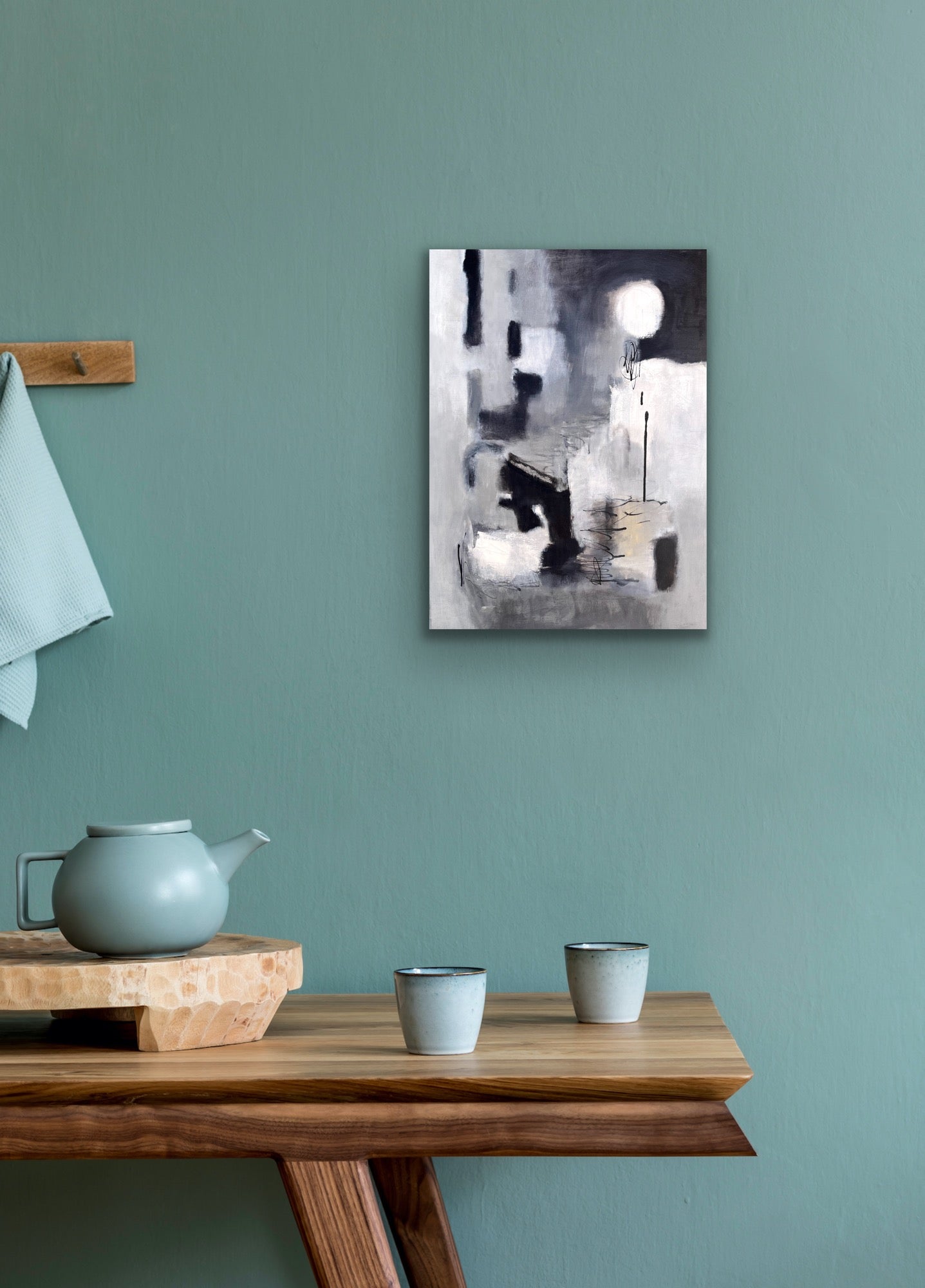 This abstract piece captures the dreamlike essence of a full moon, bathed in a delicate balance of black, white, and gray tones. The ethereal composition evokes a sense of calm and mystery, where raw, unrefined brushstrokes meet the precision of black ink details. The acrylic medium adds depth and texture, creating a celestial atmosphere that feels both otherworldly and grounded. A perfect fusion of delicate beauty and bold presence for any space.