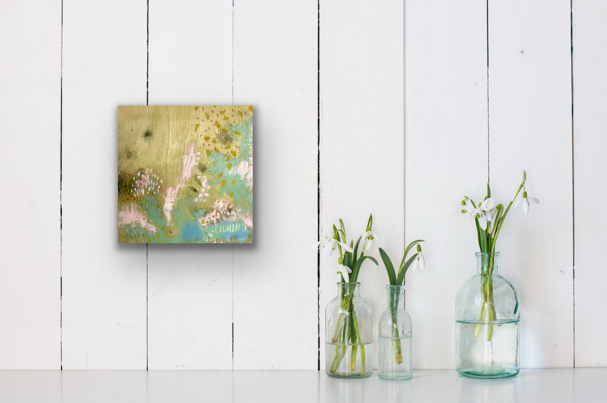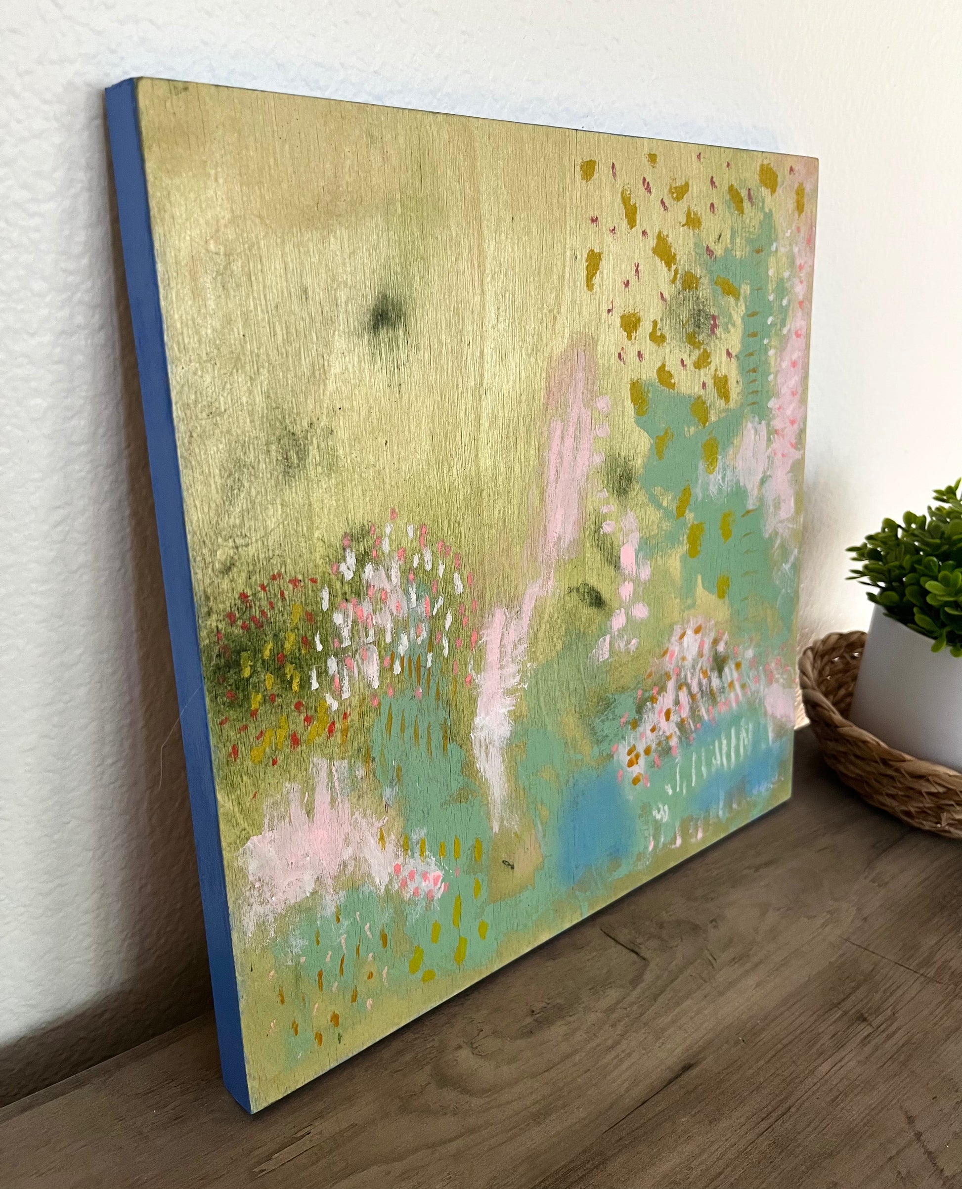 This is a simple rustic painting on wood, a departure from my work with many layers. Mossy green ink and soft oil pastel details bring this small abstract landscape to life, giving the feeling of summers in the country and afternoons spent enjoying iced tea in a meadow. The natural wood grain shows through in the lighter ink areas, adding to its charm. The sides are painted a beautiful light ultramarine blue.